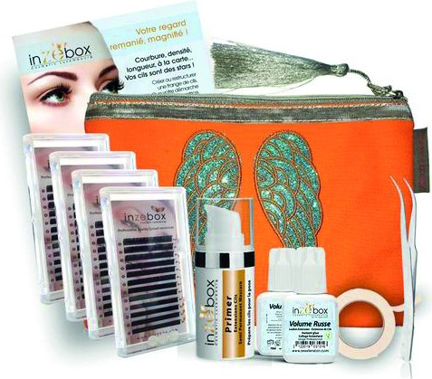 Comprenant 4 boîtes 3D (8/ 10/ 12/ 13 mm), pince courbée, scotch, colle volume russe 10ml, primer 10ml, trousse, 15 flyers, 1 affiche