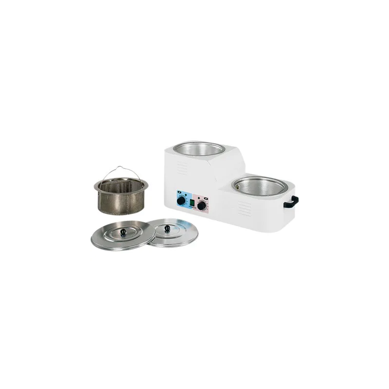Chauffe Cire recyclable avec 2 bacs décalés pour faciliter le filtrage. 1 bac de 4 litres pour la refonte avec filtration 1 bac de travail de 4 litres 1 panier 2 couvercles 2 thermostats de réglage de température jusqu'à 120°C 2 interrupteurs M/A. 2 témoins lumineux de mise en marche.