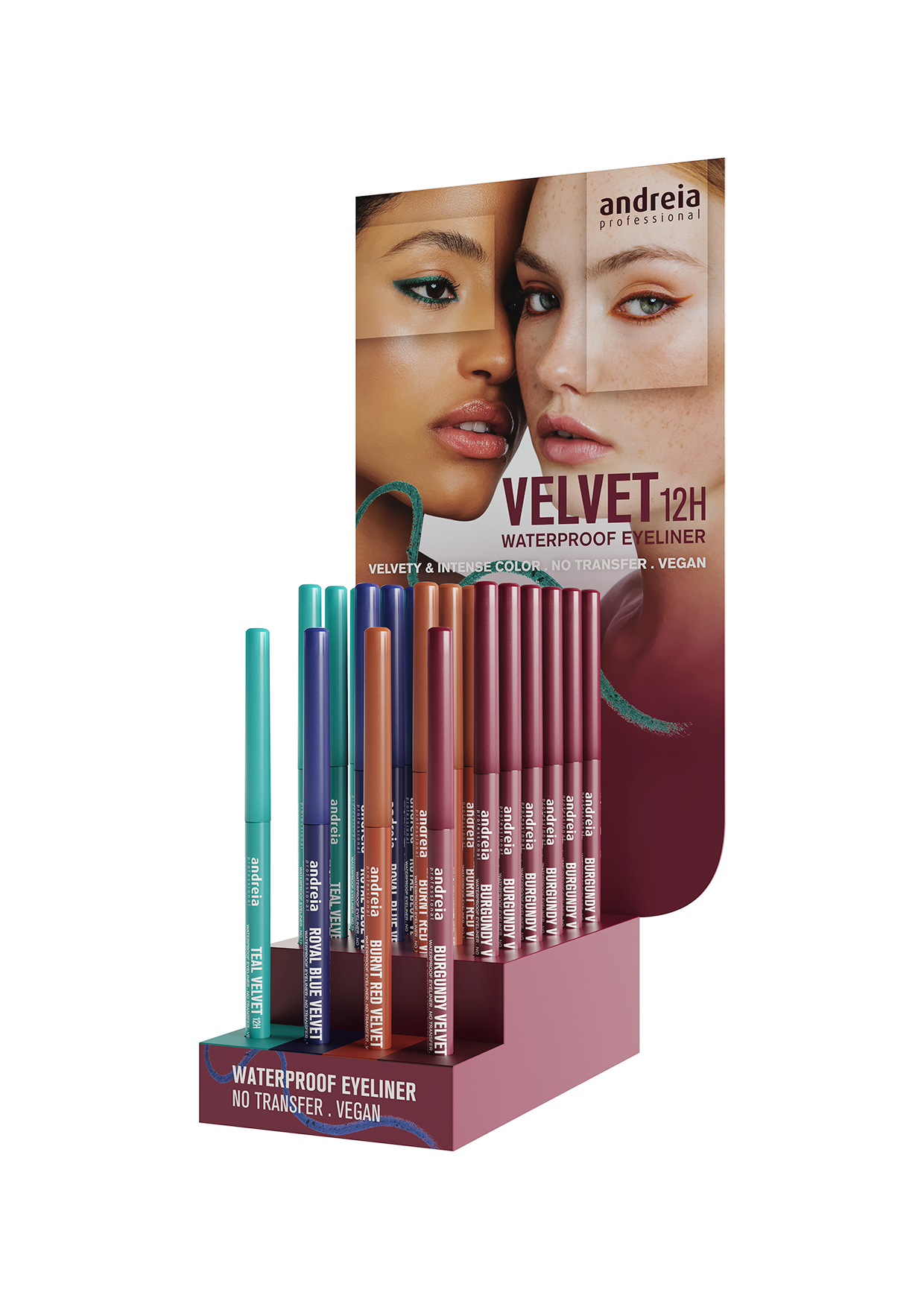 Display vide, à compléter par : 6 Teal, 6 Royal Blue, 6 Rouge-brique, 6 Burgundy ainsi qu'un testeur de chaque.