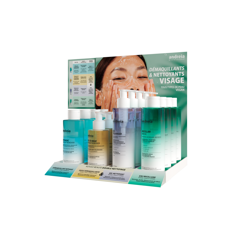 DISPLAY NETTOYANT VISAGE ANDREIA: 6 DEMAQUILLANTS, 6 HUILES, 6 GEL, 6 EAUX