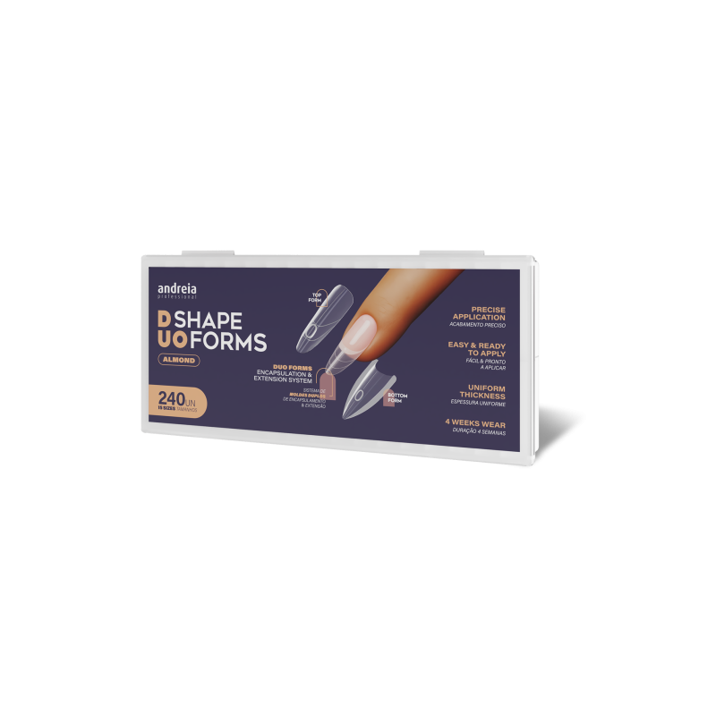 Les DUO Shape Forms - Almond (système de double moules d'encapsulation et d'extension) sont des moules de haute qualité conçus pour offrir des résultats professionnels avec précision rapidité et forme parfaite à chaque application. Idéal pour un style moderne et affirmé. Avantages principaux: • Système de deux moules complémentaires (moule base et moule supérieur) pour un encapsulage maîtrisé et extensible. • Épaisseur uniforme et finition parfaite • Compatibles avec gel acrylique et acrygel • Facile et prêt à appliquer à l’emploi • Durée 4 semaines • Adaptables à tous les types d’ongles • Courbure C pour un résultat naturel • Lignes de graduation pour un contrôle précis de la longueur • Réutilisables et faciles à désinfecter Spécifications : • Quantité : 240 unités • 15 tailles différentes • Couleur : transparente