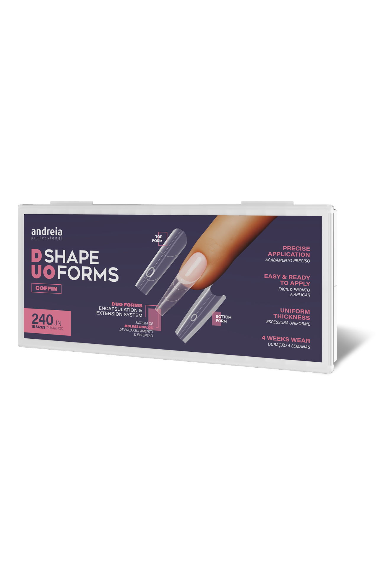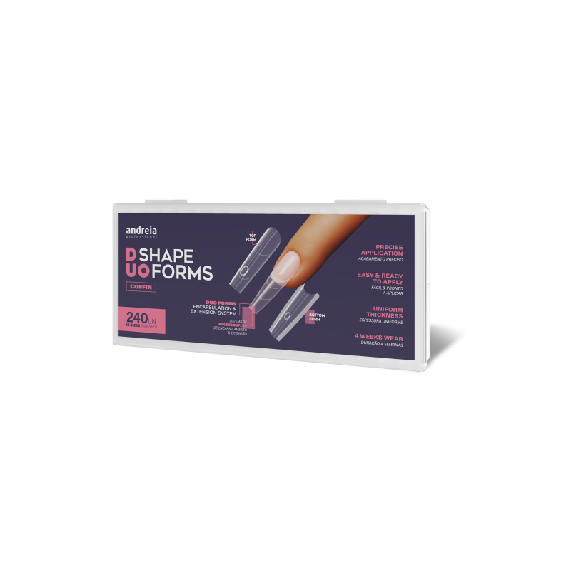 Les DUO Shape Forms - Coffin (système de double moules d'encapsulation et d'extension) sont des moules de haute qualité conçus pour offrir des résultats professionnels avec précision rapidité et forme parfaite à chaque application. Idéal pour un style moderne et affirmé. Avantages principaux: • Système de deux moules complémentaires (moule base et moule supérieur) pour un encapsulage maîtrisé et extensible. • Épaisseur uniforme et finition parfaite • Compatibles avec gel acrylique et acrygel • Facile et prêt à appliquer à l’emploi • Durée 4 semaines • Adaptables à tous les types d’ongles • Courbure C pour un résultat naturel • Lignes de graduation pour un contrôle précis de la longueur • Réutilisables et faciles à désinfecter Spécifications : • Quantité : 240 unités • 15 tailles différentes • Couleur : transparente