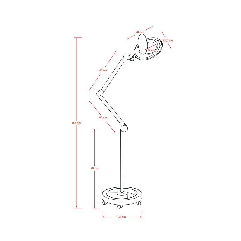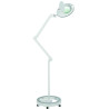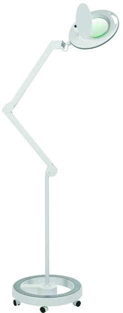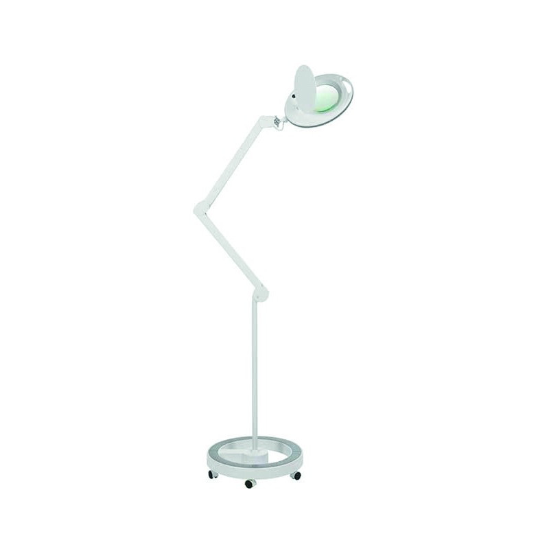 Lampe à LED de lumière froide et loupe à 5 dioptries. Equipée d'un bras articulé et d'un étau pour fixation sur tables roulantes ou chariots de beauté, ainsi que d'une base compacte à 5 roulettes de grande stabilité. Option fixation murale.