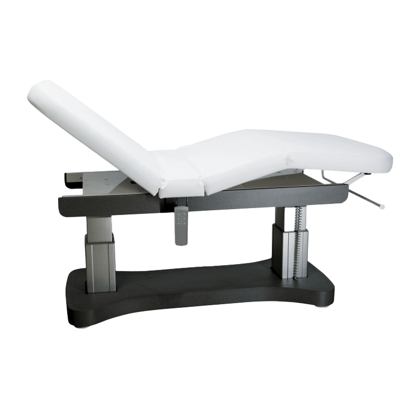 Existe en bois blanchi, wengé, blanc. 4 moteurs. Matelas ergonomique 10 cm. Trou visage inclus. L 190 x l 70 x H 50/90 cm. Garantie 2 ans.